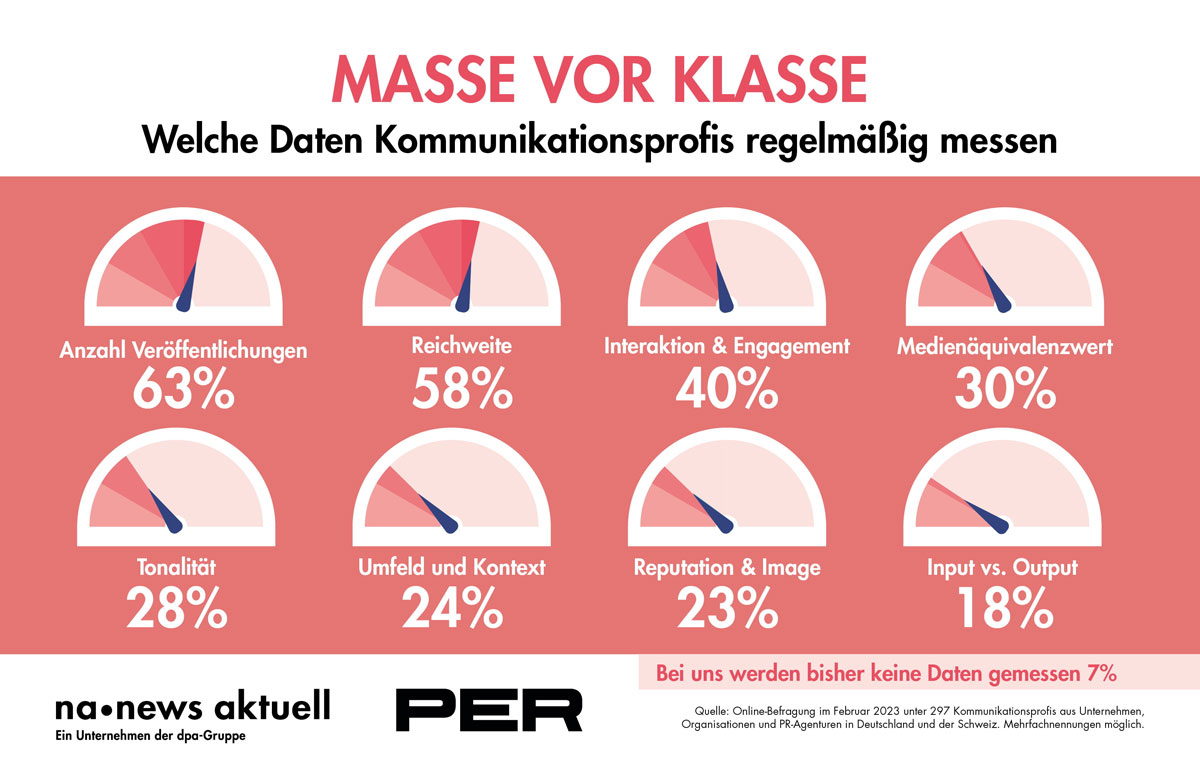 Gemeinsam mit PER haben wir uns bei 297 Kommunikationsprofis aus Deutschland und der Schweiz umgehört und wollten wissen: Wie verhält es sich aktuell mit der Messbarkeit der Kommunikationsmaßnahmen in der Praxis? Achtung, Spoiler: Masse zählt weiterhin vor Klasse.